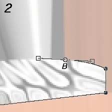 Para llegar a la vista 1 (en el punto A), tan sólo hay que hacer click de punto en punto hasta que llegamos a la vista 2. Hace falta, después de haber situado el punto B, sin soltar el ratón, desplazarse hacia la izquierda para así crear una curba y sus tangente, hasta que la curba se case con la forma del objeto, para continuar el trazo haciendo click cobre el pequeño cuadrado (manteniendo el "shift" siempre pulsado) y vemos que tan sólo la tangente a la izquierda se mueve; la desplazamos verticalmente, en dirección al próximo punto ... Cuando cerramos el bucle, con tan sólo hacer click en el interior de lo que hemos trazado, se transforma en selección.